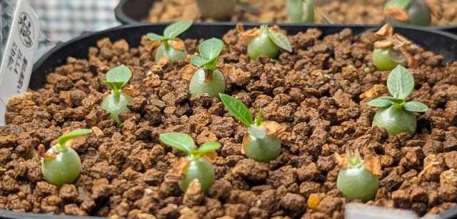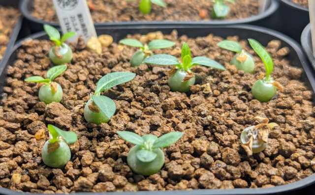 恵比寿笑い パキポディウム実生 Nw恵比寿笑い 2025実生 成長記録 恵比寿笑い 2025.06.062026.02.15 Pachypodium brevicaule @mmp_gardening ニワネコさんから新鮮な恵比寿笑いの種子を譲って頂いた。昨年から恵比寿系をたくさん増やしたい欲が高かったのでありがたい。 目次 2025.5.8 播種2025.5.172025.5.292025.7.152025.8.72025.10.22026.1.13 2025.5.8 播種 新鮮 2025.5.17 2025.5.29 2025.7.15 恵比寿笑いには光が強すぎた。反省。 2025.8.7 2025.10.2 2026.1.13