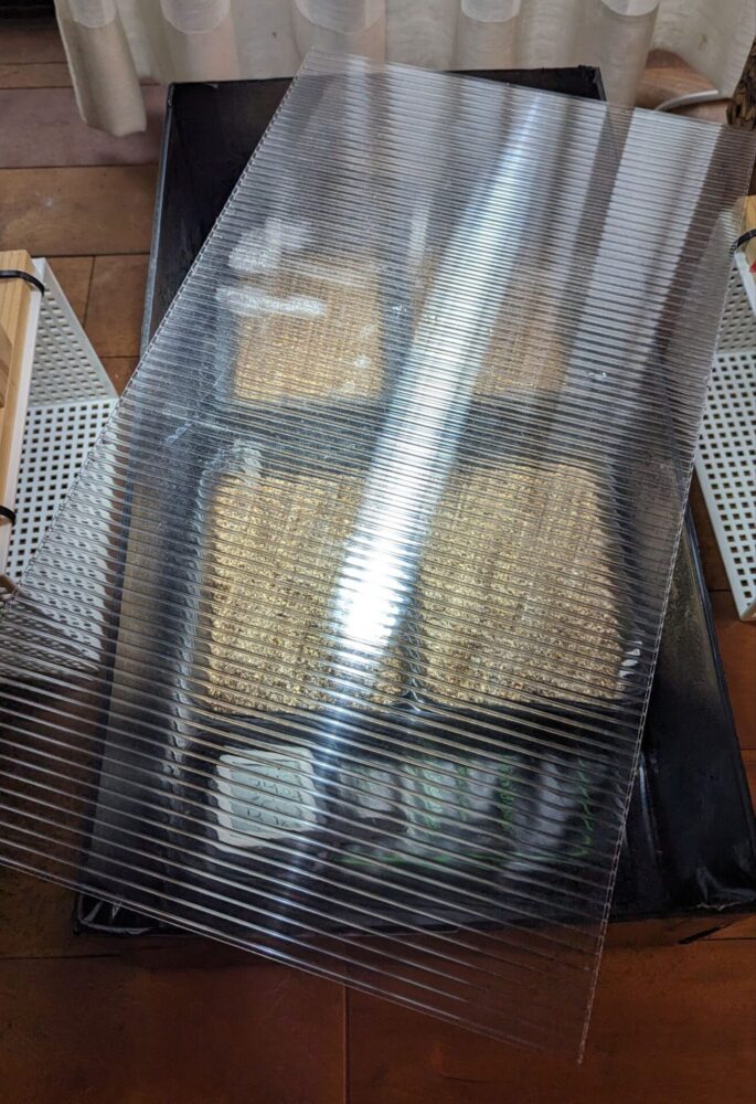囲いと底用のプラダンを切ってテープで止めて、配線用の穴を開けて、透明のプラダンでフタを作って完成