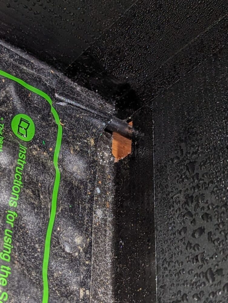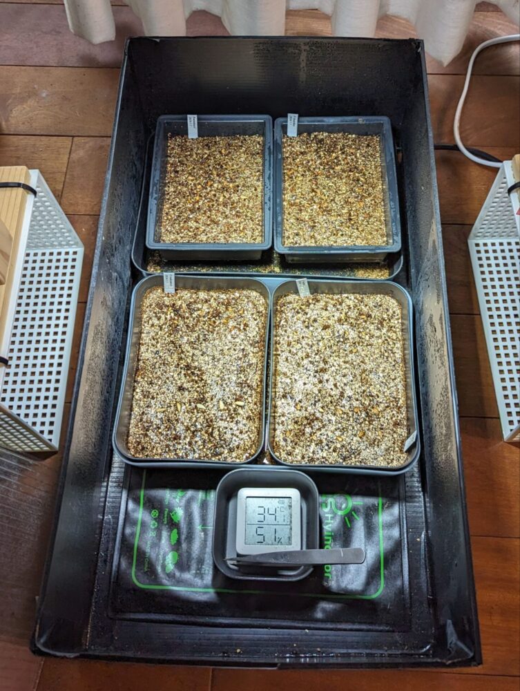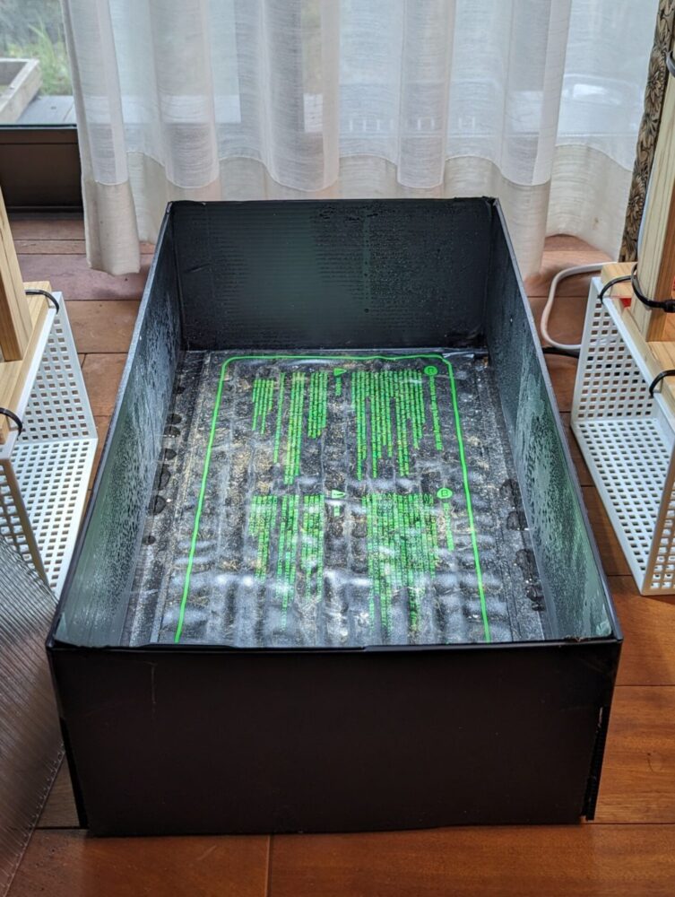 こんな感じで播種した容器を入れる。温度もそこそこ上がってきてる。フタをすると温度が上がりすぎる可能性がある。昼間に室内の暖房、育成ライトのせいで35℃をoverしてしまう事も。運用しながら状況によって適した使用方法を模索する必要がある。