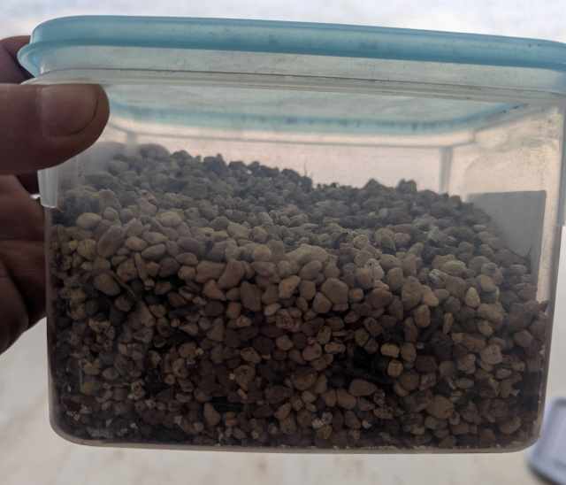あと、赤玉はどうしても劣化して潰れて泥になり排水性の妨げになってしまうので少なめがいいかなってことで。鹿沼土は最初に利用してたんだけど藍藻(青藻)が大量に発生してしまったのでなんとなく。それと水を吸うと黄色く変化するのがちょっと好みに合わない。