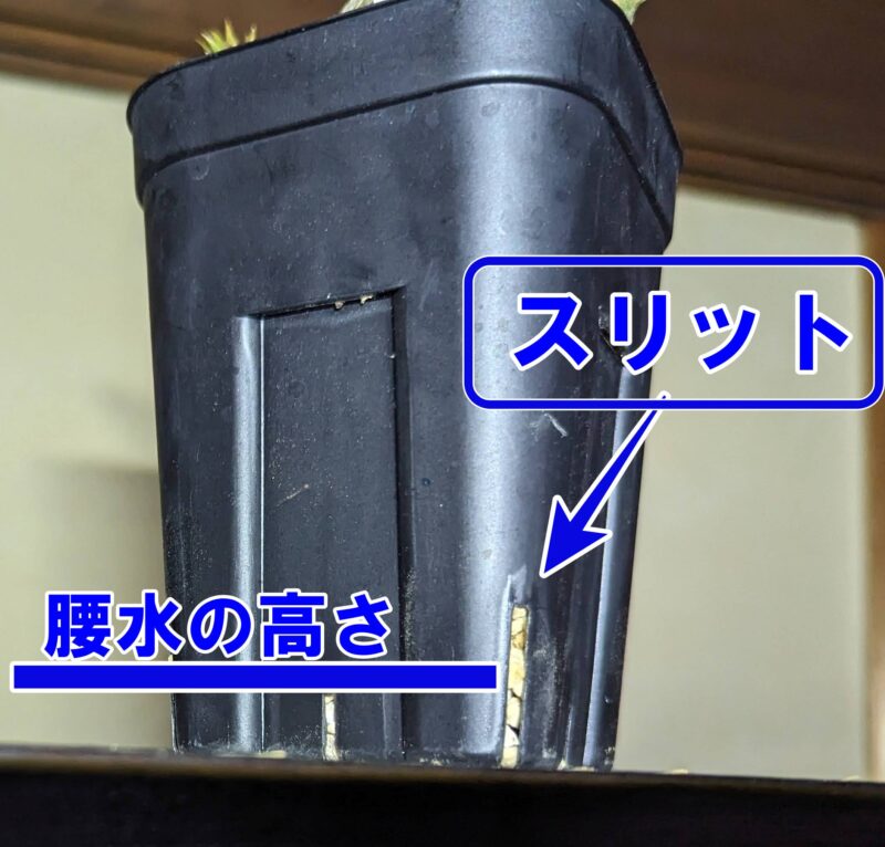 今度は腰水の高さを浅くすることにした。理由は鉢の半分も水が浸かっていては鉢内の空気が滞ってしまうのではないか?それならばスリットの半分ぐらい腰水にして、スリットの上半分は空気の通り道、スリットの下半分は水に浸けておくことにした。