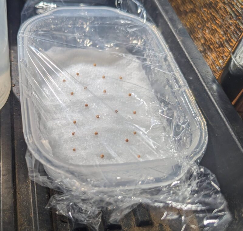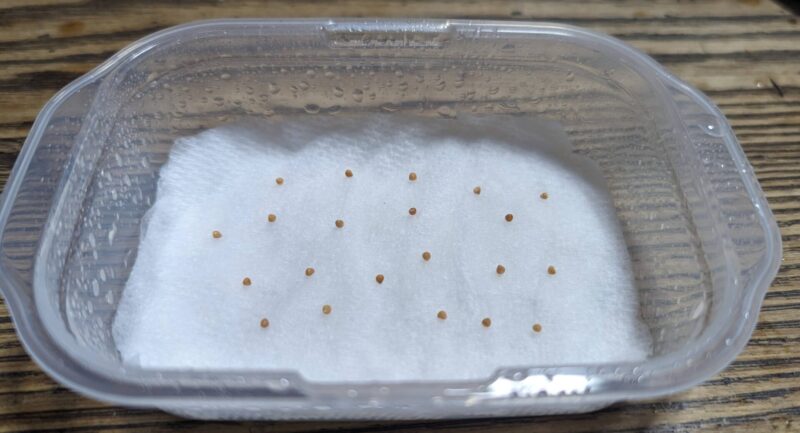 タッパにキッチンペーパーを数枚敷いてメネデールを含ます。その上に処理の終わった種子を置く