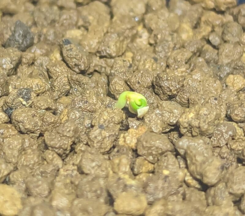 11日目にして初の発芽確認。他の種子にも動きがある。少しでもたくさん発芽して欲しい。根がしっかり出たら用意した土に植える。