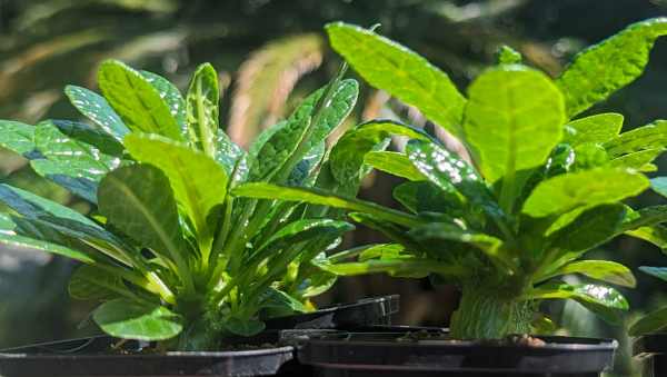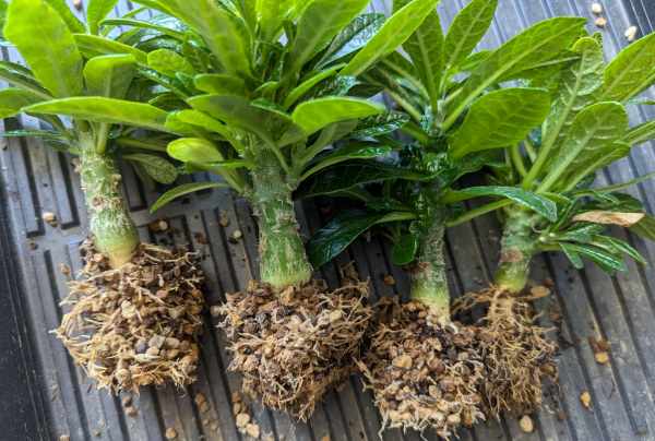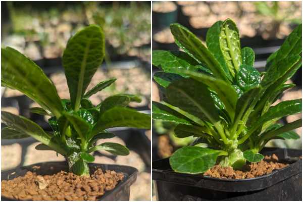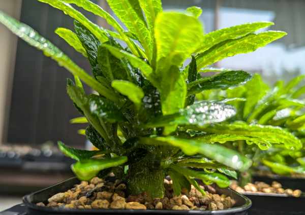 思いのほか早く大きく育ったので根回りが早く鉢の大きさで株の成長に差が出てきたかも。これが原因なら鉢を大きくすればズングリ傾向になってくれるのかと鉢増し。
