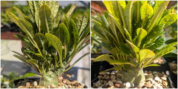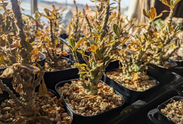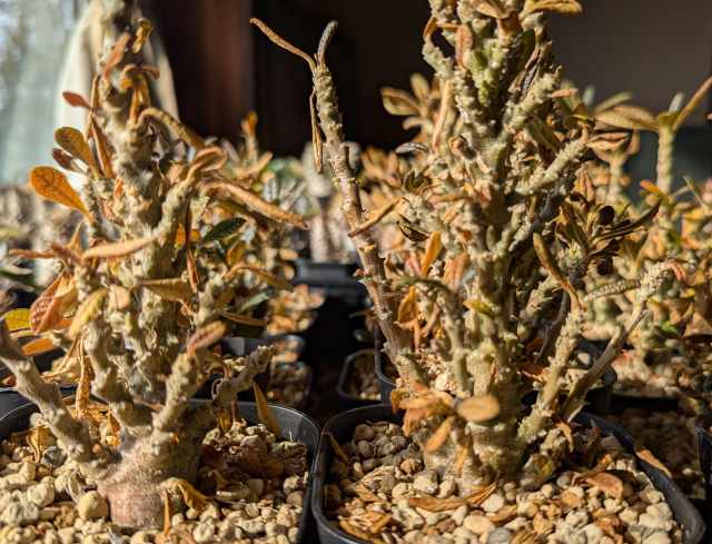 1月頃から加温室へ移動し枯れさせまいと過保護管理した結果が良かったのか3月中旬になり小さな濃い葉がチラホラと芽吹き始めたかと感じたら幹も緑色になり復調の兆し。折れ曲がっていた子も立ち上がり幹も膨らんできている。