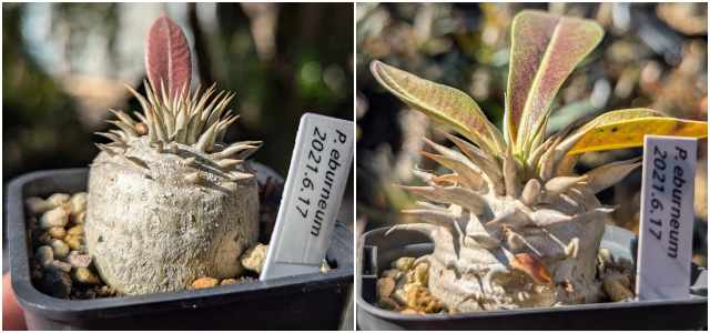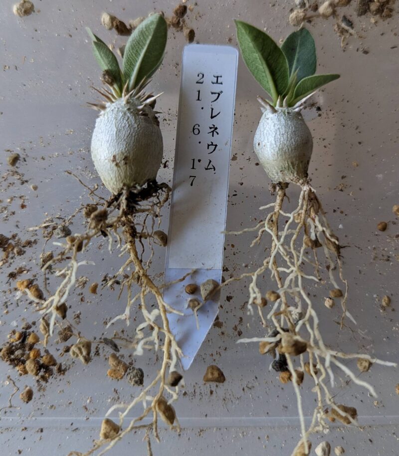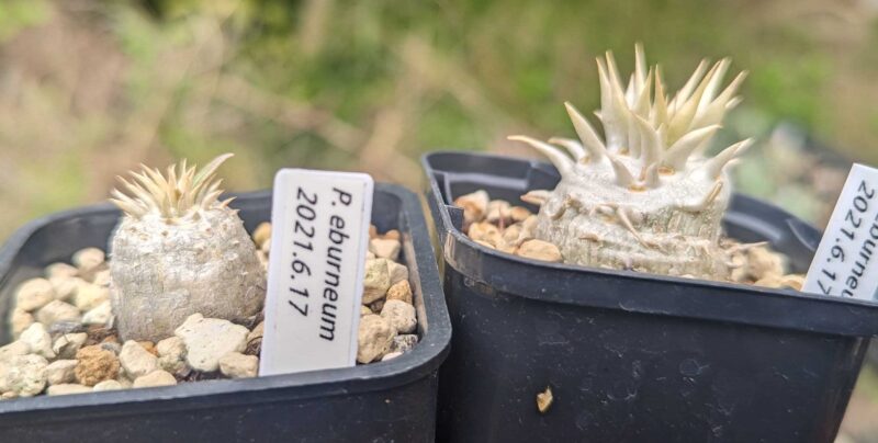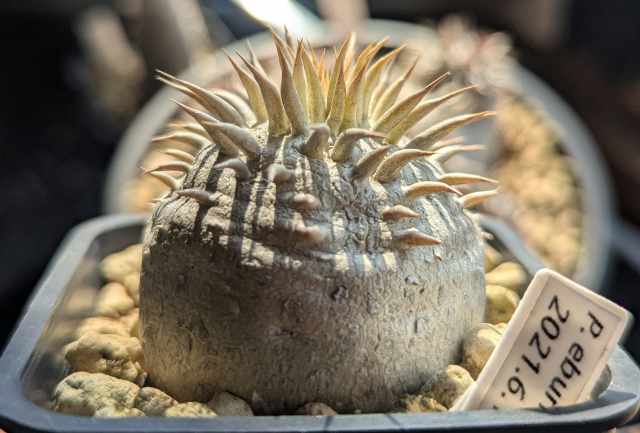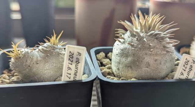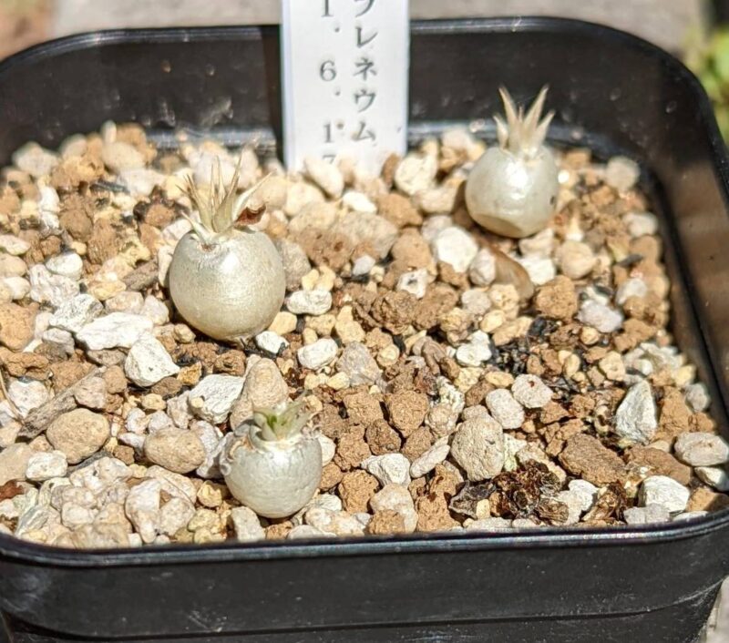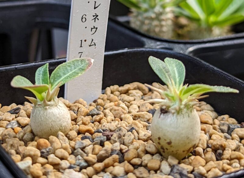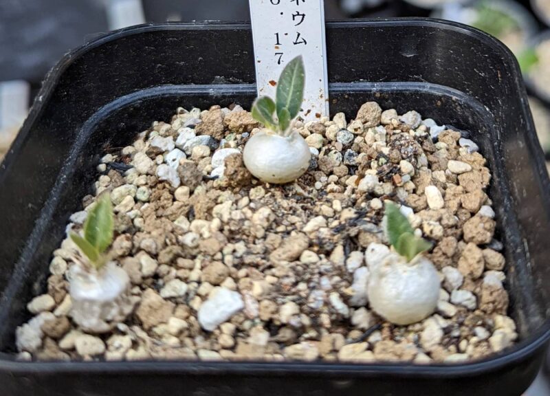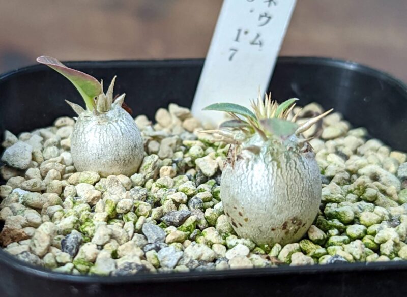 パキポディウムの実生を始めた当時、早い段階で播種したエブレネウム。いろんな情報を見て選んだ理由は丸い塊根になりやすく伸びにくくズングリしたフォルムに簡単になりそうだったから。全然思い通りにならなかった…
