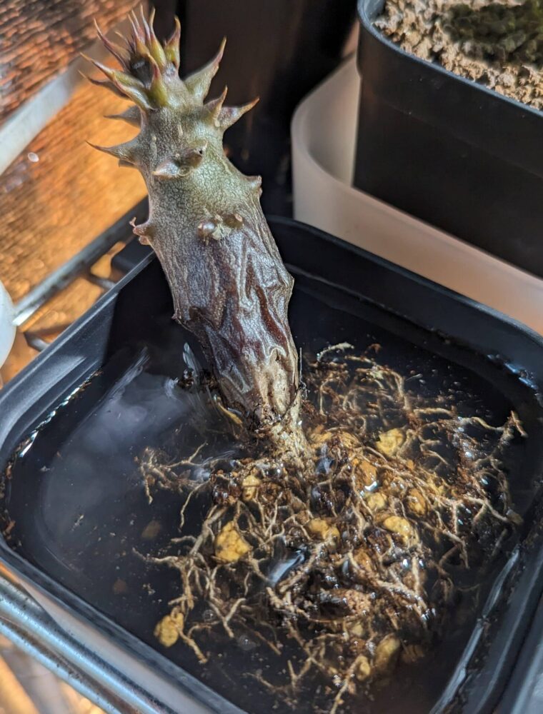 根の状態を見ると根腐れでは無さそう。一応殺菌処理、メネデール浸水で復活を試みるが変化なし。