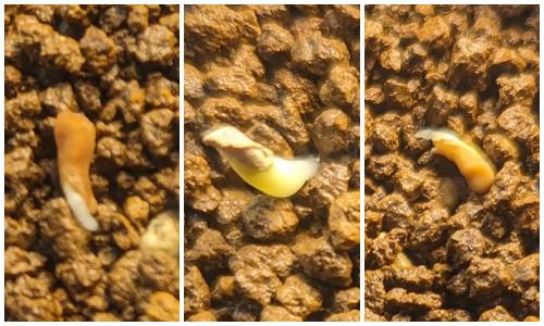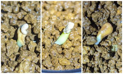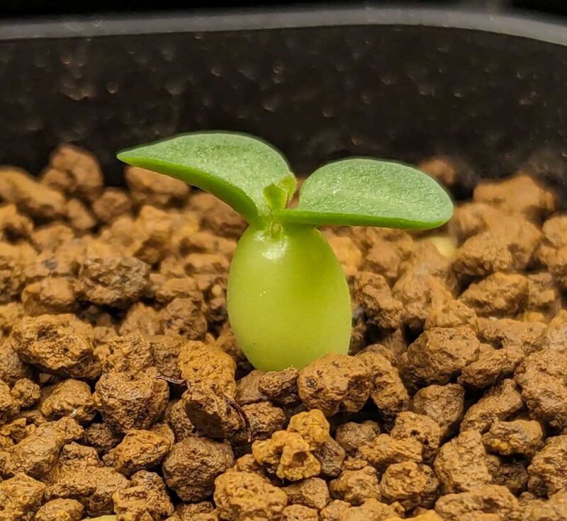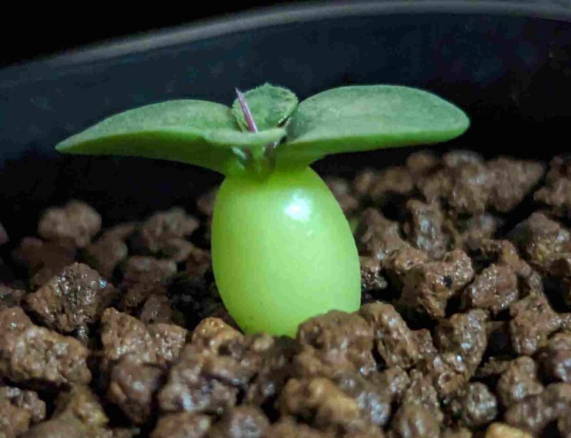 3/5の発芽。左右の根は弱弱しい。ナマクアナムの発芽初期は太い根が出ると認識しているがコレは明らかに弱弱しい。心配…