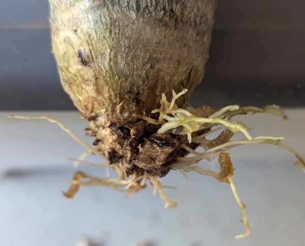 処置からずっと水苔が乾燥しないように水分補給をしていた甲斐もあり新たな根を発根してくれた。経過を記すと発根はある程度早い段階で確認できたが幹の凹みがなかなか戻らなかった。原因として考えられるのは処置後は新葉を放置していたが、それが原因だったのだろう。新葉を再度カットしたら幹が元に戻った。