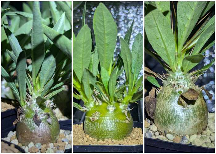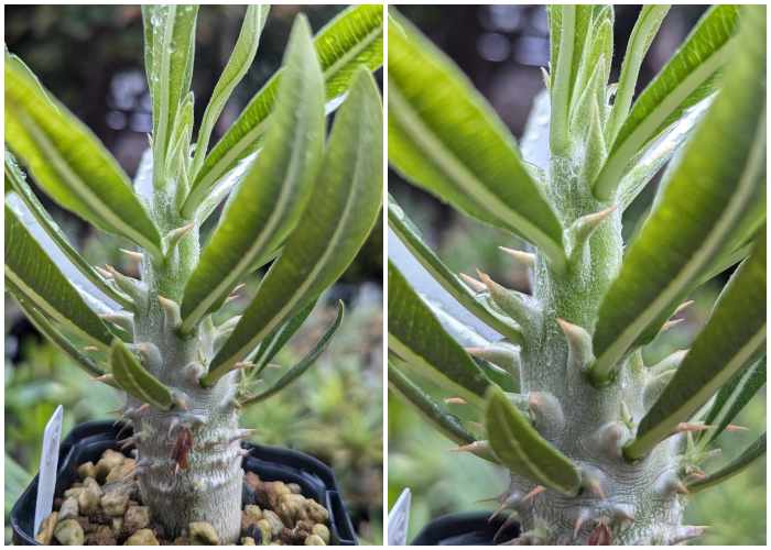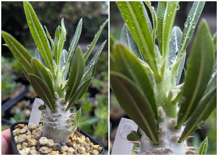 ソレは幹の上部に新緑として現れたり、葉の異常な大きさもある。パキポディウムの樹皮には棘があり、棘の間隔が広がらないように詰まらせて成長させた方が見栄えが良い※個人的感想。しかし様々な要因により下の写真のように木質化した塊根部から青々した成長部が急激に成長し、ヒョロっと伸びてしまっている。