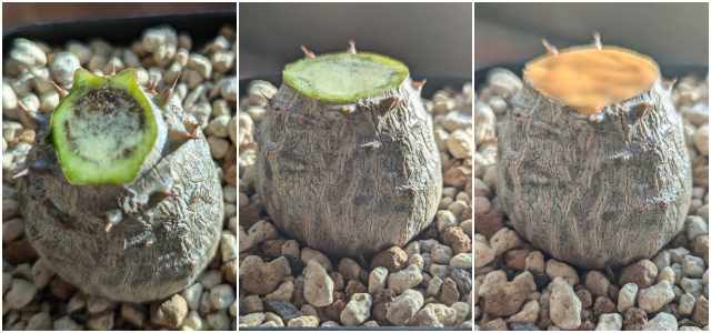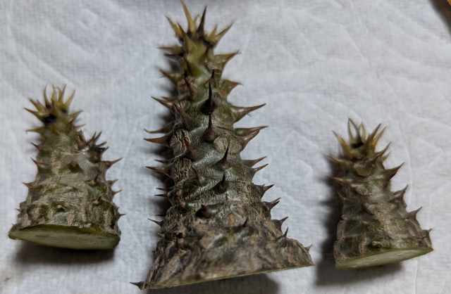 とりあえず腐った部分をカットして延命を図ろうかなと。カッターでスパッと。1枚目は腐りがかなり進行していてOUT。2、3枚目はキレイな部分が残っているので乾燥させてトップジンを塗って処置。接木も考えたけどめぼしい株もないので。