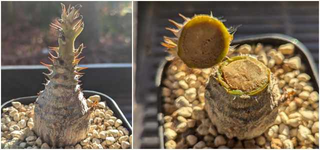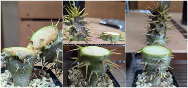 凍傷を避けるためLEDのみの加温室に移動していたが今度は下からブヨブヨになり腐ってきた。見た目ではわからないが触るとフヤけた水風船のように柔らかくなっていた。根腐れのような症状だが水は常温を少量湿らす程度に与えただけ。もしかしたら急に暖かい環境の変化が影響していたかもしれない。