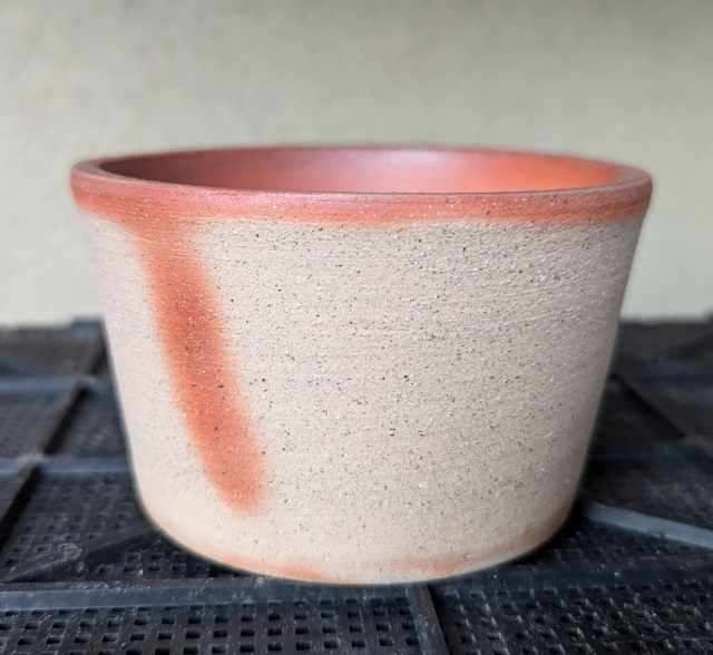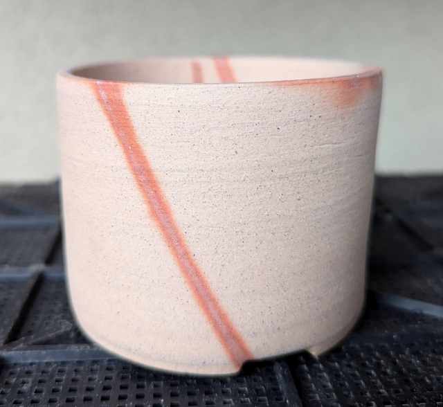 ホームセンターや植物屋さんに行くと光沢がありキレイで様々な形の鉢がたくさん売られている。この光沢は焼成時に釉薬を塗りガラス繊維の膜を纏っているからなのだが、再生備前の鉢には塗られていない。それにより鉢自体の通気性能を重視し用土の乾燥を促してくれる。内側の底面は緩やかな湾曲になっていて水が溜まらないようになっている。高台・水切りはデザインを損ねないように設計されているが排水性は損なわれていない。底穴は大きめに開けられており、やはり排水性を重視してある。