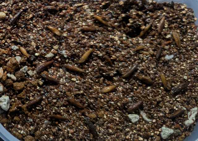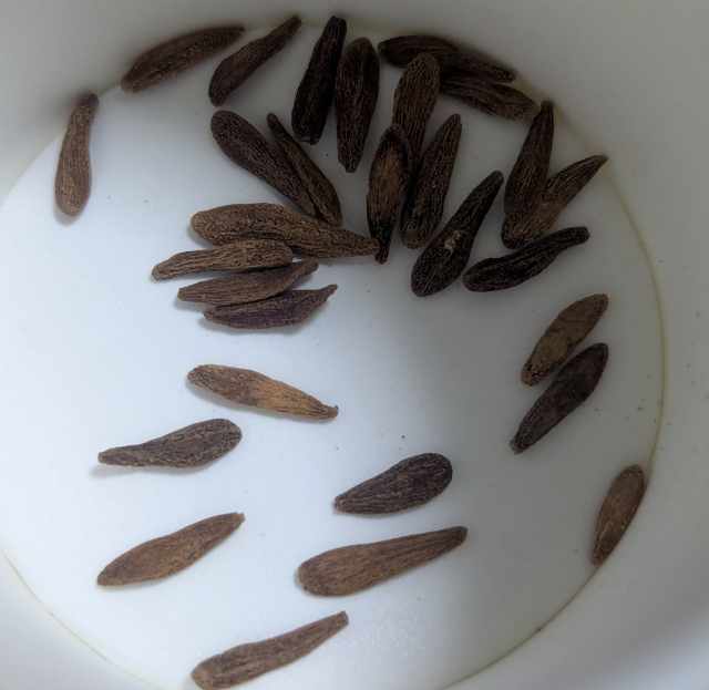 アンボンの種子は黒いほど良い結果が出ると感じている。今回は…悪くない。今回は殺菌2時間、メネデール22時間、計24時間浸けた。アンボンの種子を浸けると浸けた液が茶色く着色する。なんとなく気持ちが悪いので一度液の交換をした。
