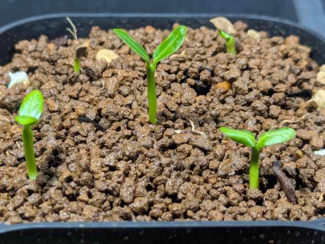 4発芽確認。播種から10日目。他の種子も反応しだした。もちろんカビも増殖中。