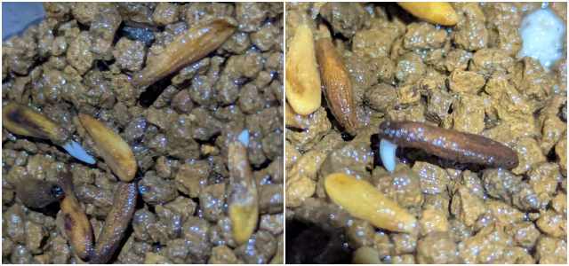 アンボンゲンセは播種前の処理時にあまり長い時間浸けすぎない方が良いのではないか?今回も初めに2時間ベンレートで浸けたが、白っぽい種子が割れていたり、芽ではない何かが飛び出ていたり、そして何よりピンセットで摘まむと柔らかくなっている。やはりなっ…てことで浸水は2時間のみ、早速熱湯消毒した播種用土に載せる。