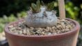 用土を入れた状態。底石に軽石を使用。中段には赤玉、川砂、腐葉土、ゼオライト、苦土石灰、竹炭を混ぜて使用。表土には赤玉細粒を敷く。腰水管理が前提なので水持ちの良い用土で下から水を毛細管現象を利用して吸い上げられる事を想定する。常に土中は湿っている状態になるので根腐れ防止用にゼオライト、竹炭を使用。苦土石灰は…原産地の環境に近づけたくて2025の自分的流行り。