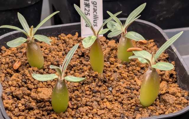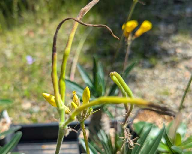 やっと自分で播種した実生グラキリス株から種子が採れた。昨年、花はたくさん咲いたが結実せず残念な思いをしたが、ついに自家採取に成功。鞘の半分が黒く変色して諦めていたのでネットを掛けずに露天放置していたら鞘が弾け地面に種子っぽいのが落ちていたので拾ったので5粒しかなかったが。