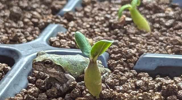 カエル。用土が常に湿っているので涼みに来ているのか。いいんだけど…苗に触れられると簡単に倒れたり引っこ抜かれたりは勘弁してほしい。