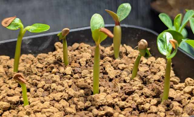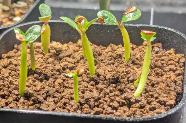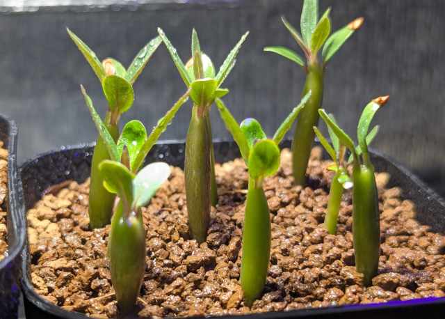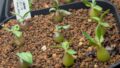 やっぱり伸びた。いつもはここから本葉が出る時にも子葉の付け根から伸びて本葉が出てくるのでそこを抑えたい。