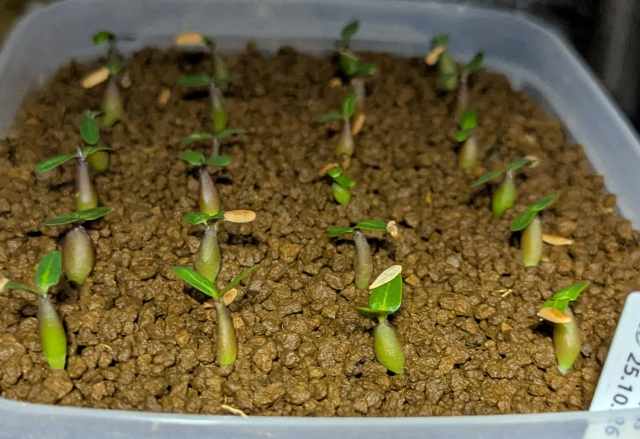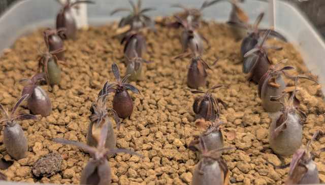 グラキリス グラキリスパキポディウム塊根植物実生育成..育て方.播種.記録 グラキリス 2025.10.25実生 成長記録 グラキリス 2026.01.282026.02.15 苦手な秋蒔き。加温室でヌクヌクと冬の間に幼い時期に成長させようと毎年やっているが、いつも寝てしまうので今回は寝かさないように早めに加温室を稼働させ寒さに当てないように管理する。 ウインゾリーで試しているタッパの底、側面に沢山の穴を開けて使用する。用土は有機質を多めに腐葉土を混ぜ込んである。※肥料は無し 播種から1ヶ月後 2026.1.13 播種から3ヶ月。やっぱり寝かせてしまった。このタイミングで寝てしまうと春に起きない事が多い。そして成長も遅くなる。