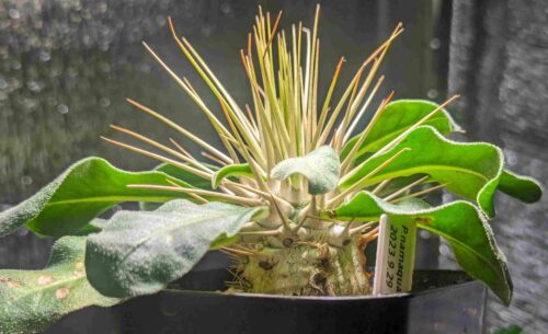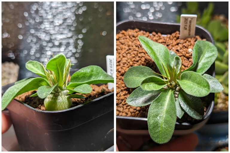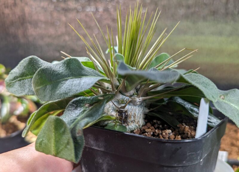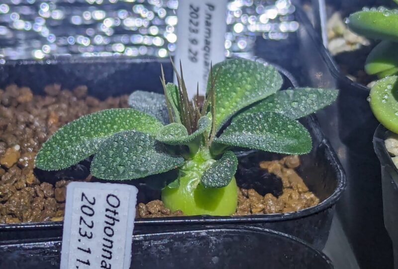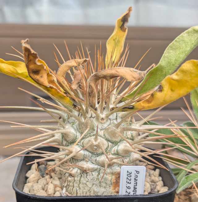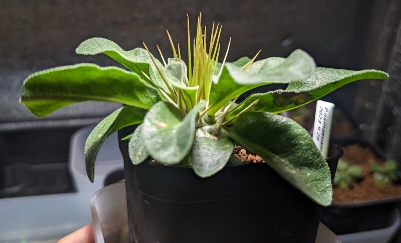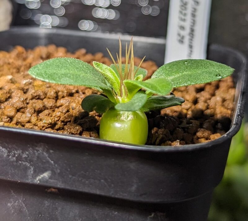 黒い部分が気になるけど、すこぶる順調。加温室の隅でLEDの光が弱い場所で管理。腰水継続中。