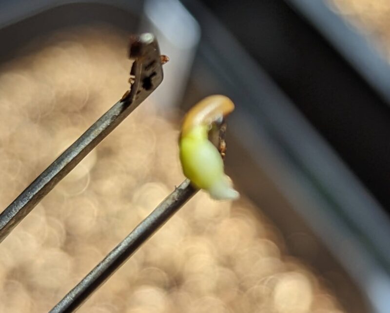 ピンボケ・・・。殻は取れてないけど塊根部がプックリ。根はまだ伸びておらず、この状態が移し替えにはベター。発芽確認できたらスグがベストかも。