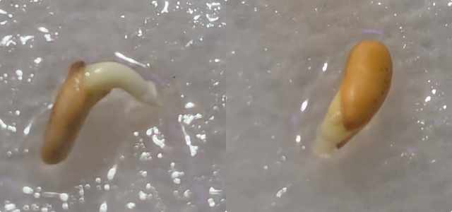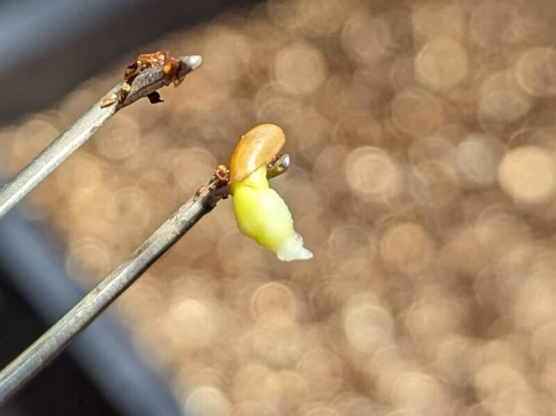 殻がなかなか取れない場合も多くある。殻が取れなくて腐ってしまう苗も見てきた。かといって早まって殻を強引に取るのも小葉が千切れたりして危険なので殻に霧吹き等で水分を含ませ生命力にかける。ただあんまり遅いようなら強硬手段を行う。小葉が千切れたとしても、まずは生かし、本葉が出てこれば問題ない。