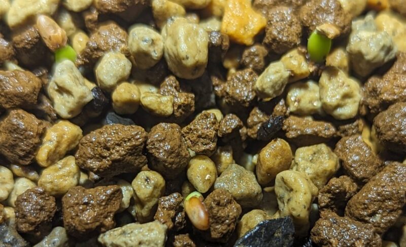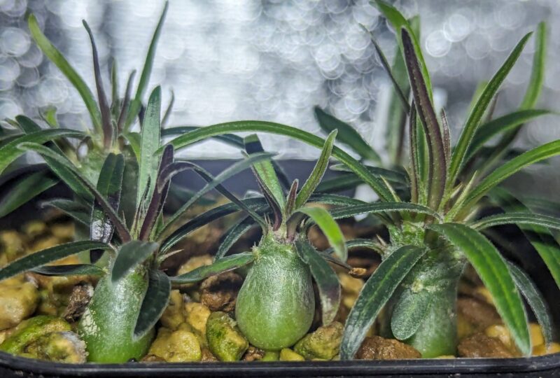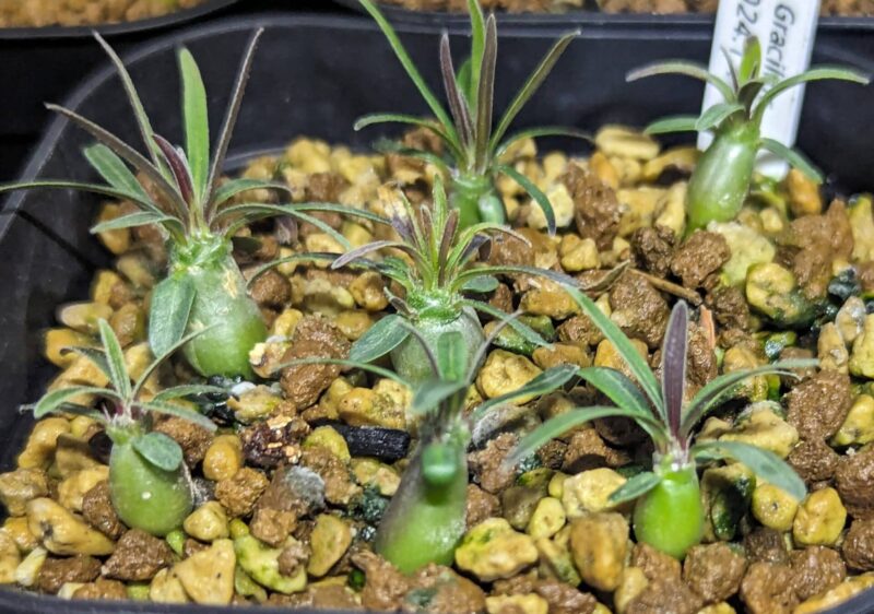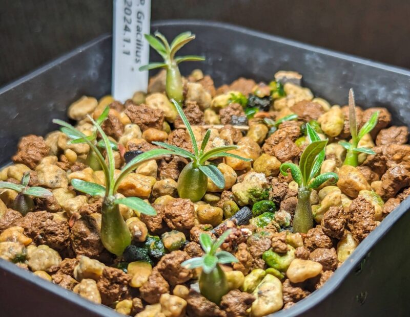 すでに成長に差が出始めている。育成環境なのか種子の状態だったのか。徒長させないようにしっかりLEDの光を当て、腰水管理。用土はすでに通常の物を使用しているので肥料(牛糞)が入っていて青藻が出てきてしまった。せめて表土に赤玉の細粒を敷けばよかったと後悔。見た目が悪いが成長には問題ない…と思う。